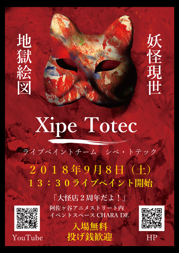 昨年、Taigaがイラスト展示でお世話になった、阿佐ヶ谷の妖怪専門店「大怪店」の2周年記念イベントに、Xipe Totecが参加します。